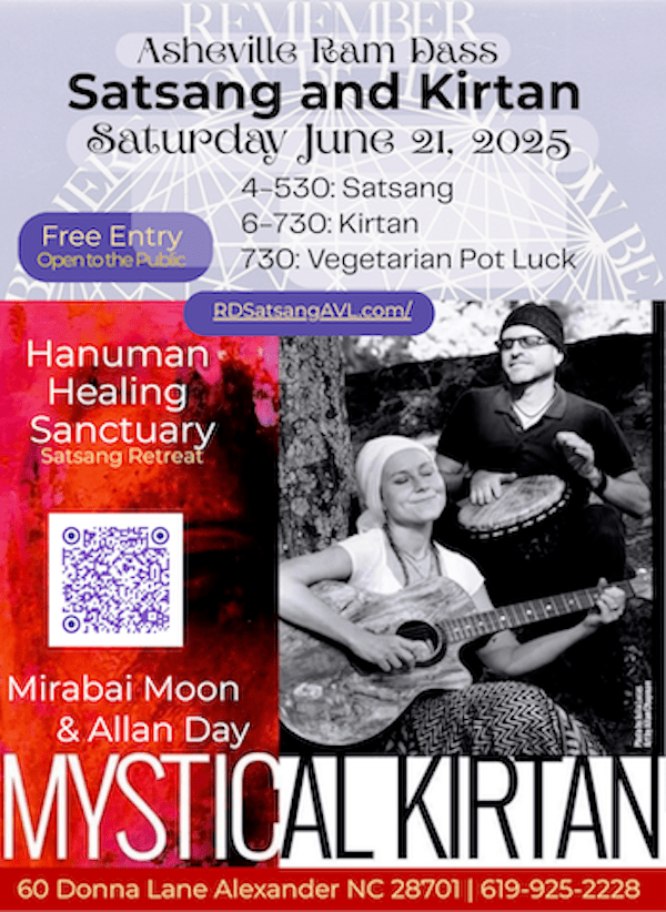 We are an Asheville Based community rooted in the teachings of Ram Dass, Neem Karoli Baba, and the timeless wisdom of the bhakti path. This Satsang (spiritual gathering) is a space for seekers to come together in love, devotion, and deep inquiry—supporting each other on the journey of awakening.